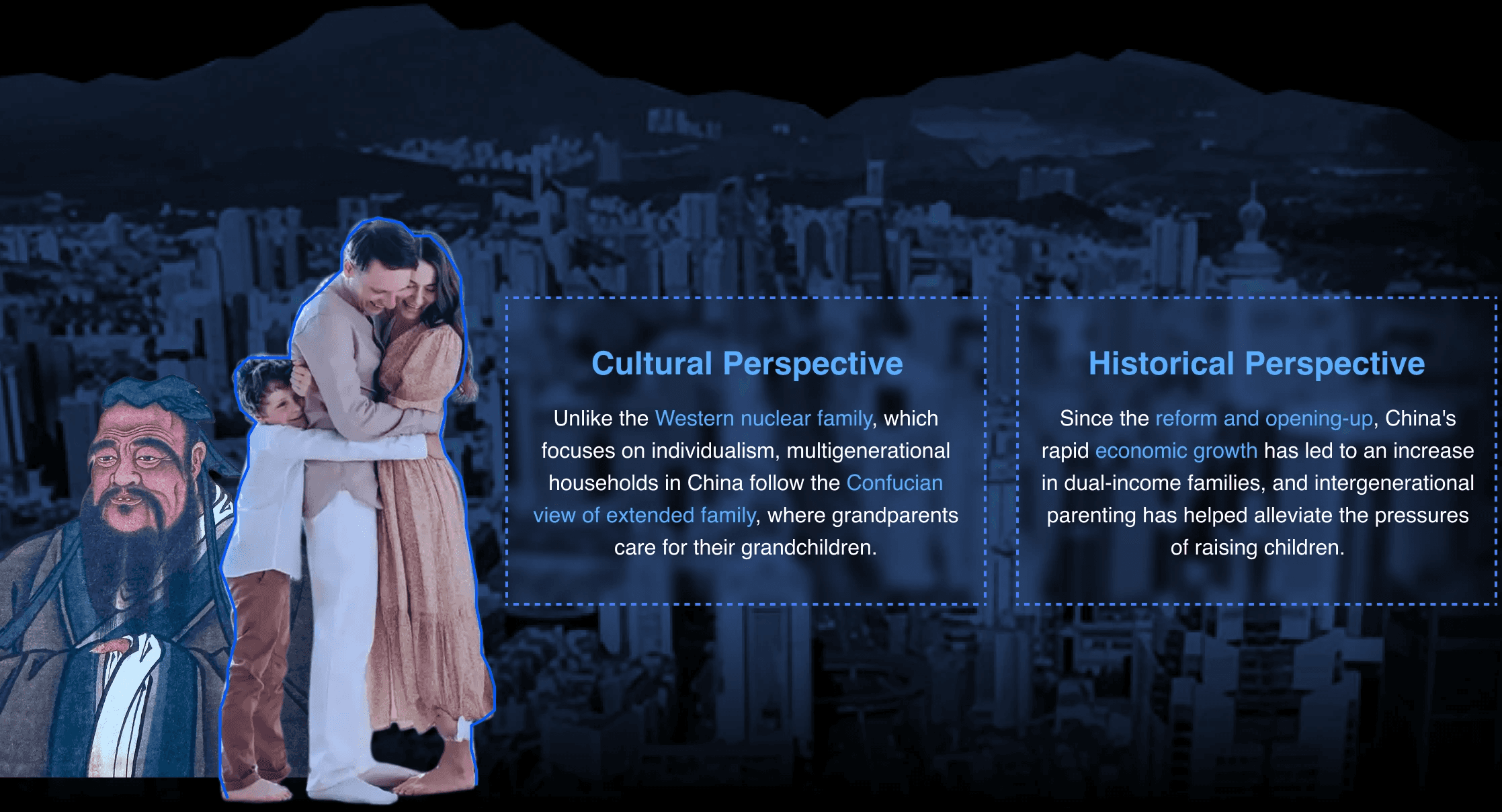 Intergenerational parenting refers to a childcare model where the parents and grandparents share the responsibility of raising children, and has become a strategy for 80% of urban Chinese families.