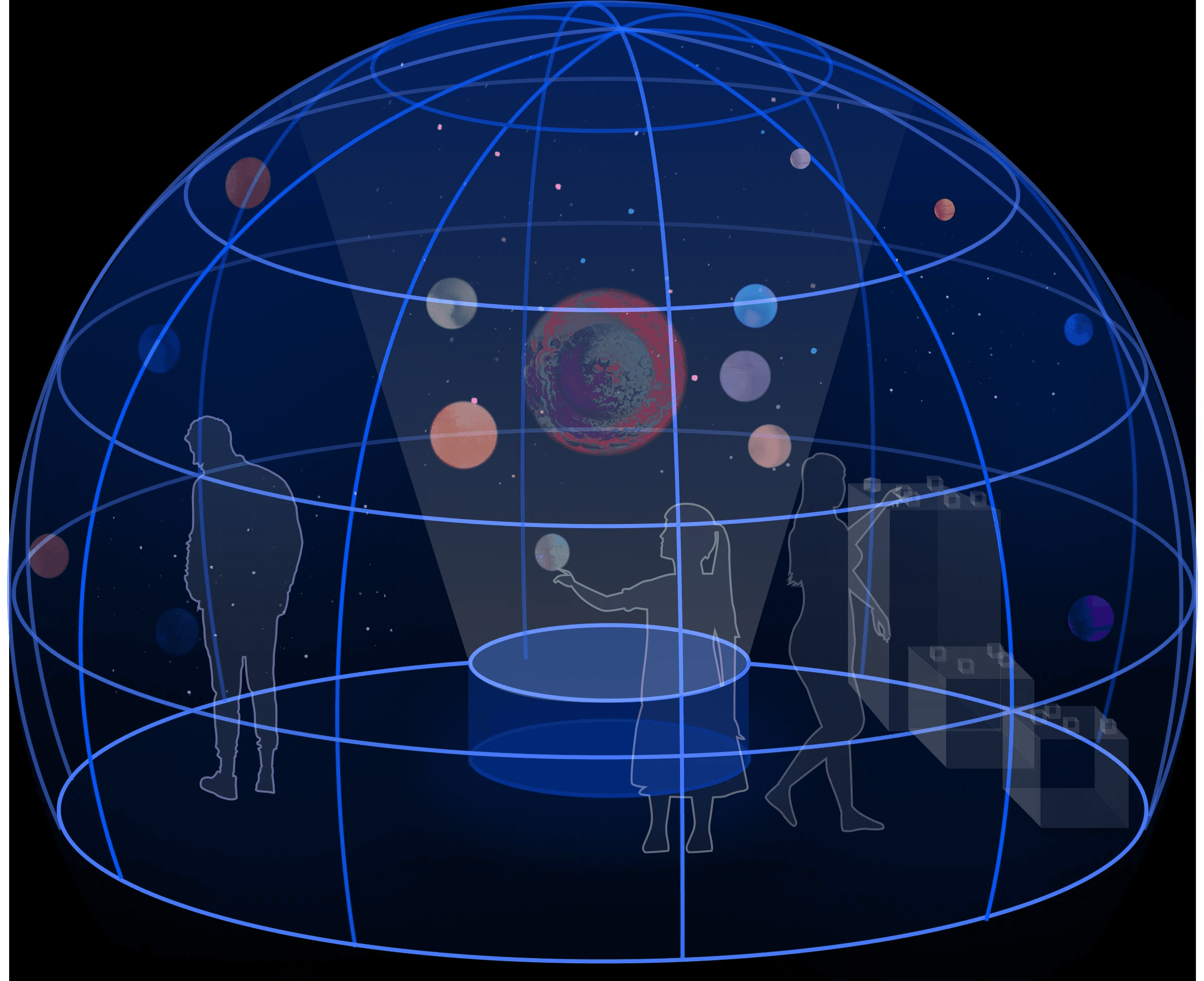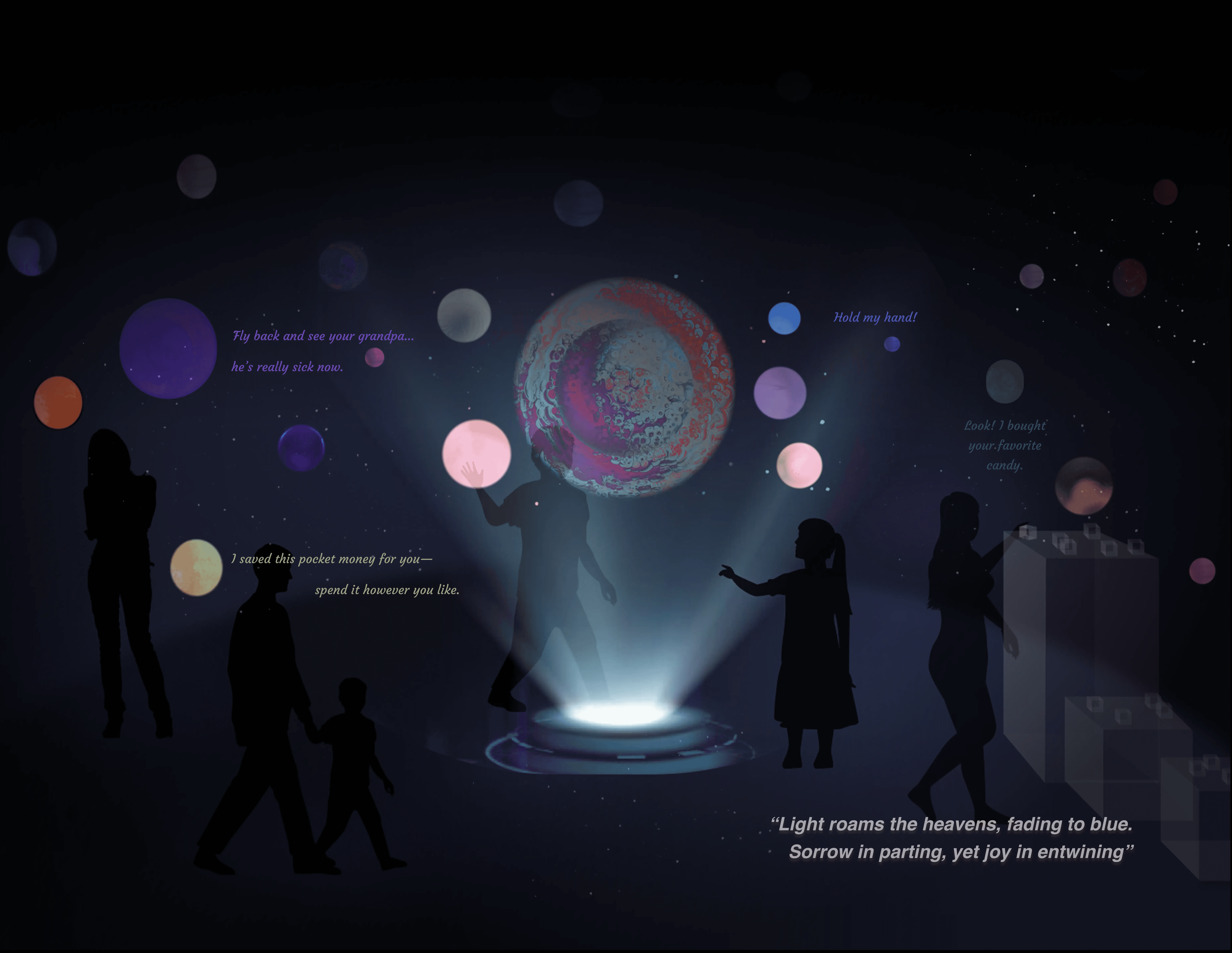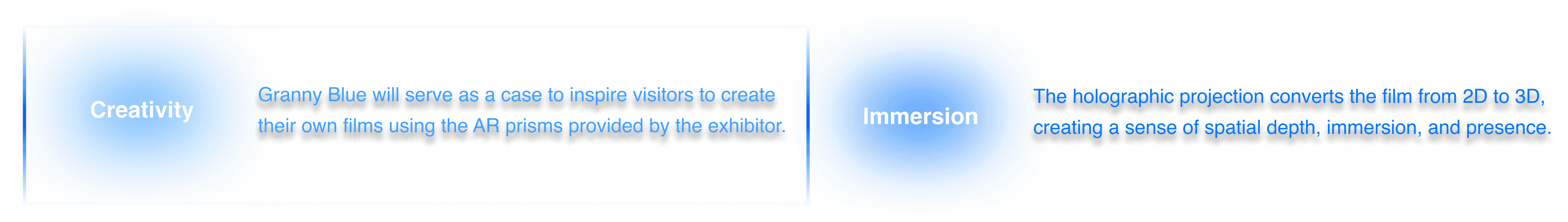 I hope to present Granny Blue in a more immersive way, making the audience to feel as if they are surrounded by the universe and the ocean while watching the film. Therefore, I chose holographic projection as the medium, leveraging its spatial and three-dimensional qualities to enhance the sense of presence and emotional resonance.