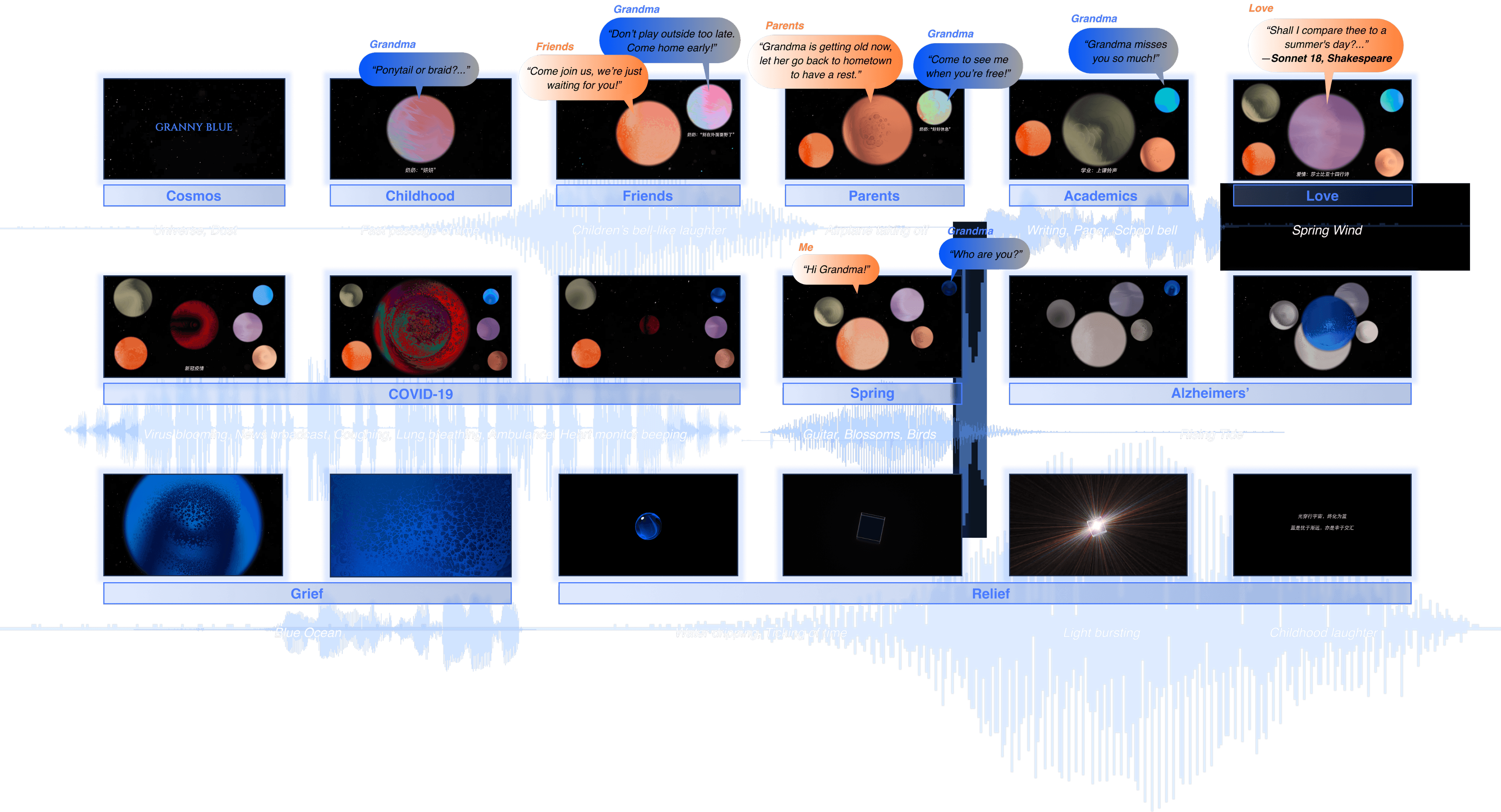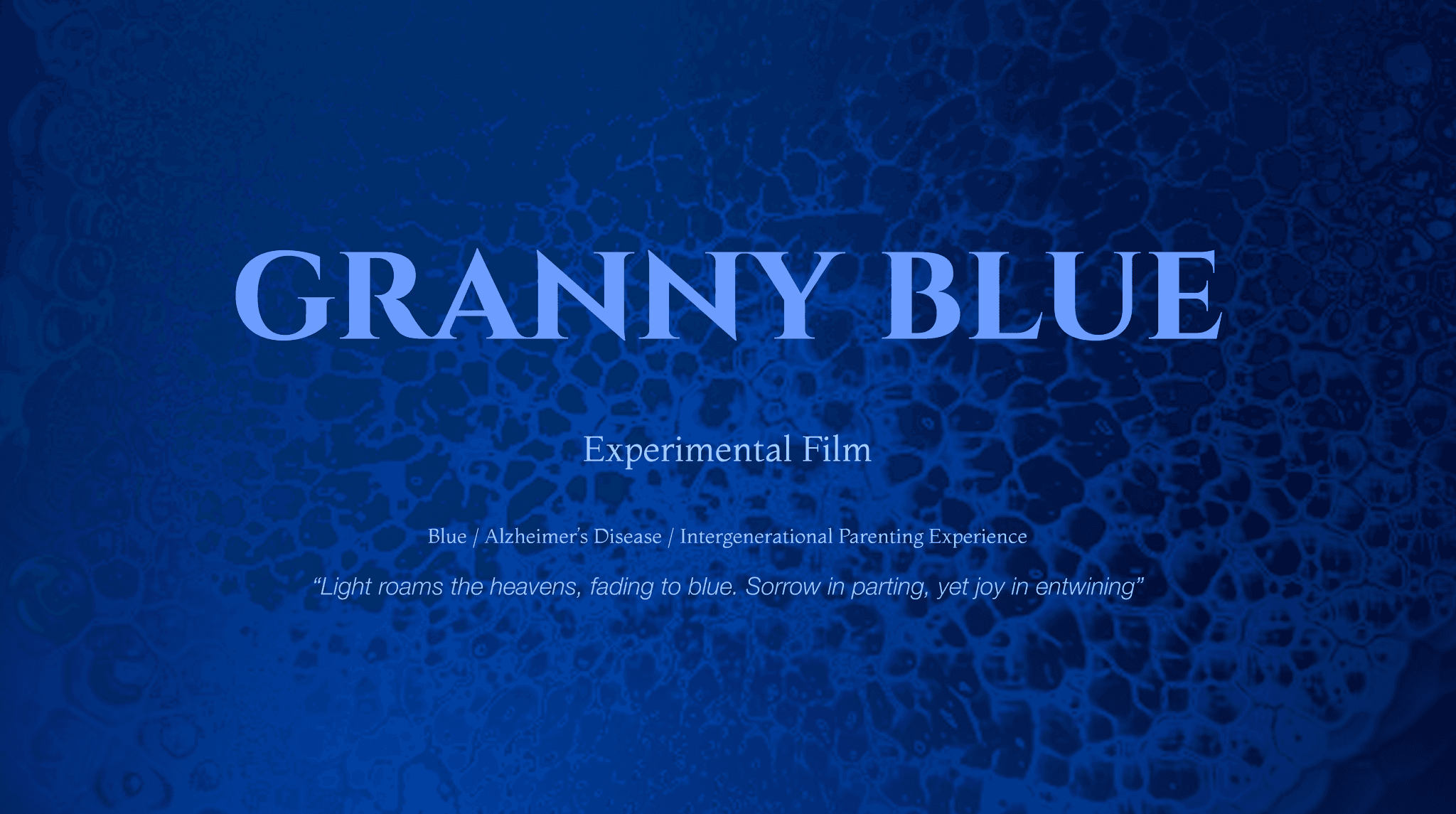 Granny Blue is an experimental film that use color and sound narrative to express unspoken grief over my grandmother's Alzheimer's. The film combines psychological and optical theories of the color blue to illustrate my impression of her shifting from vibrancy to a muted, blue-toned state. This personal narrative aims to evoke a shared feeling among those with intergenerational parenting, presented via holographic projection and AI-augmented AR prisms to create an immersive space.