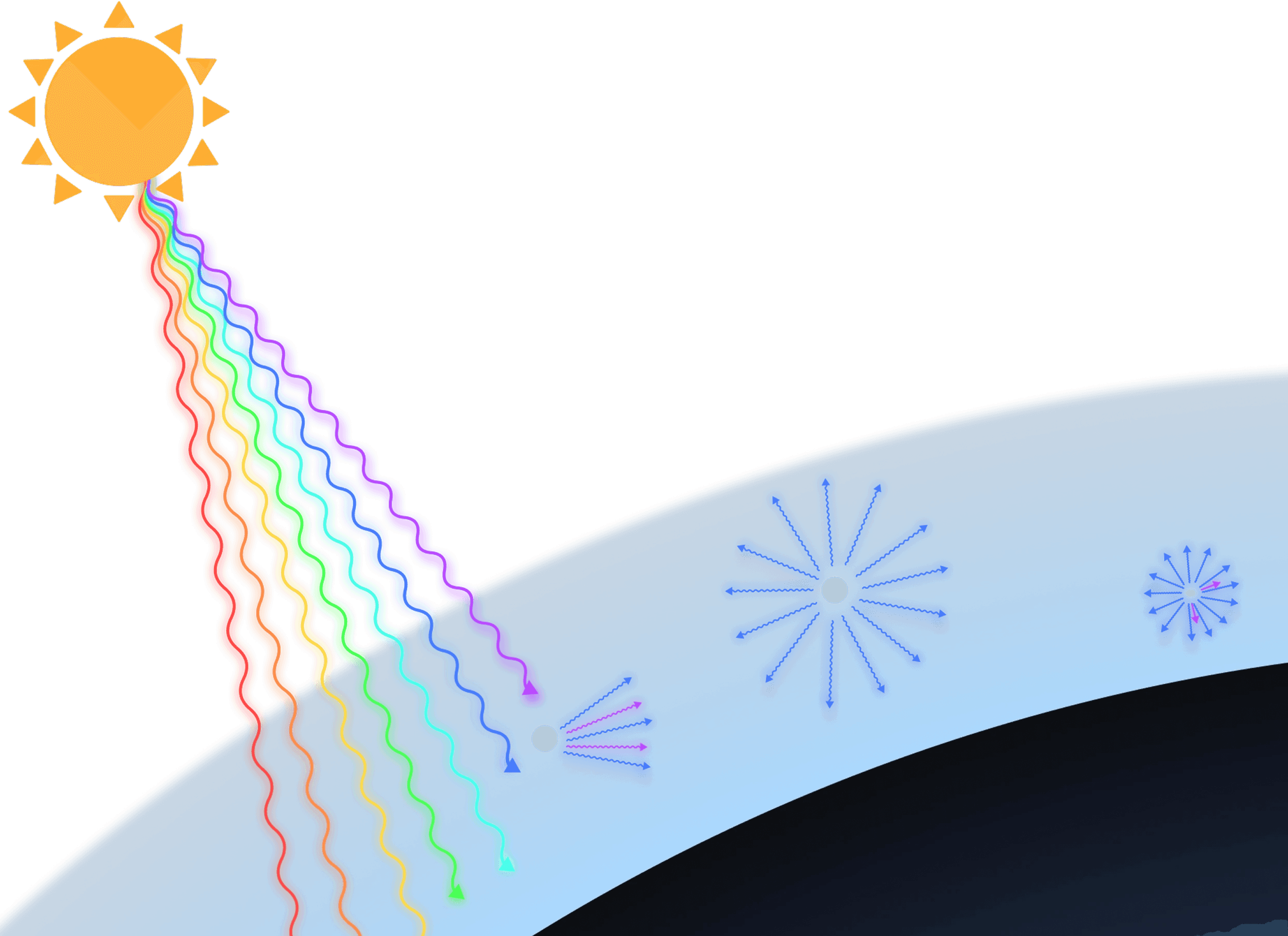 When sunlight interacts with molecules and particles in the Earth's atmosphere, Rayleigh scattering occurs. The scattering intensity of blue light (about 400-450nm) is about 10 times stronger than that of red light (about 650-700nm), which causes blue light to fill the entire sky.