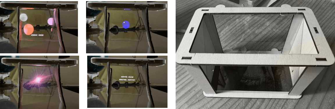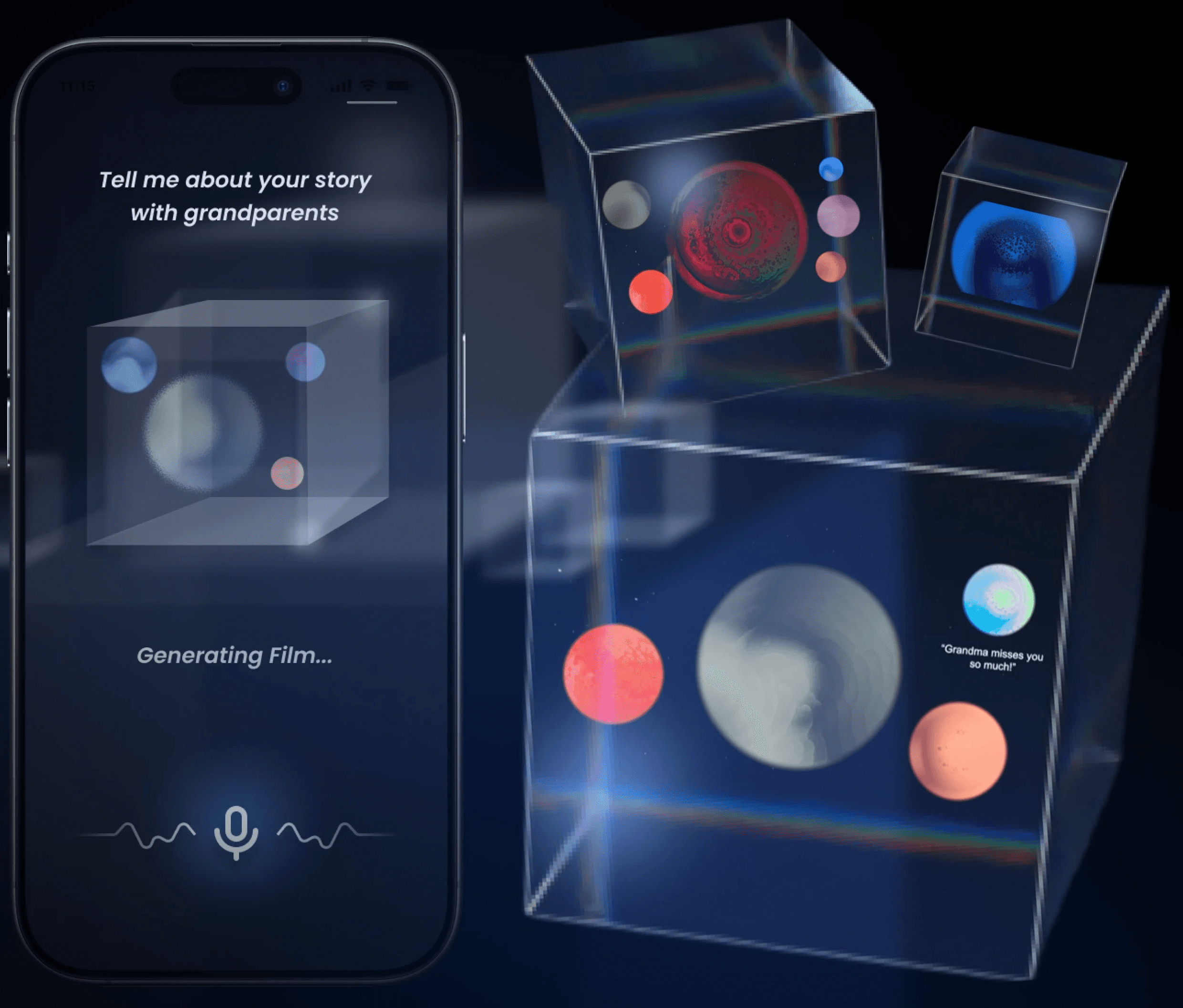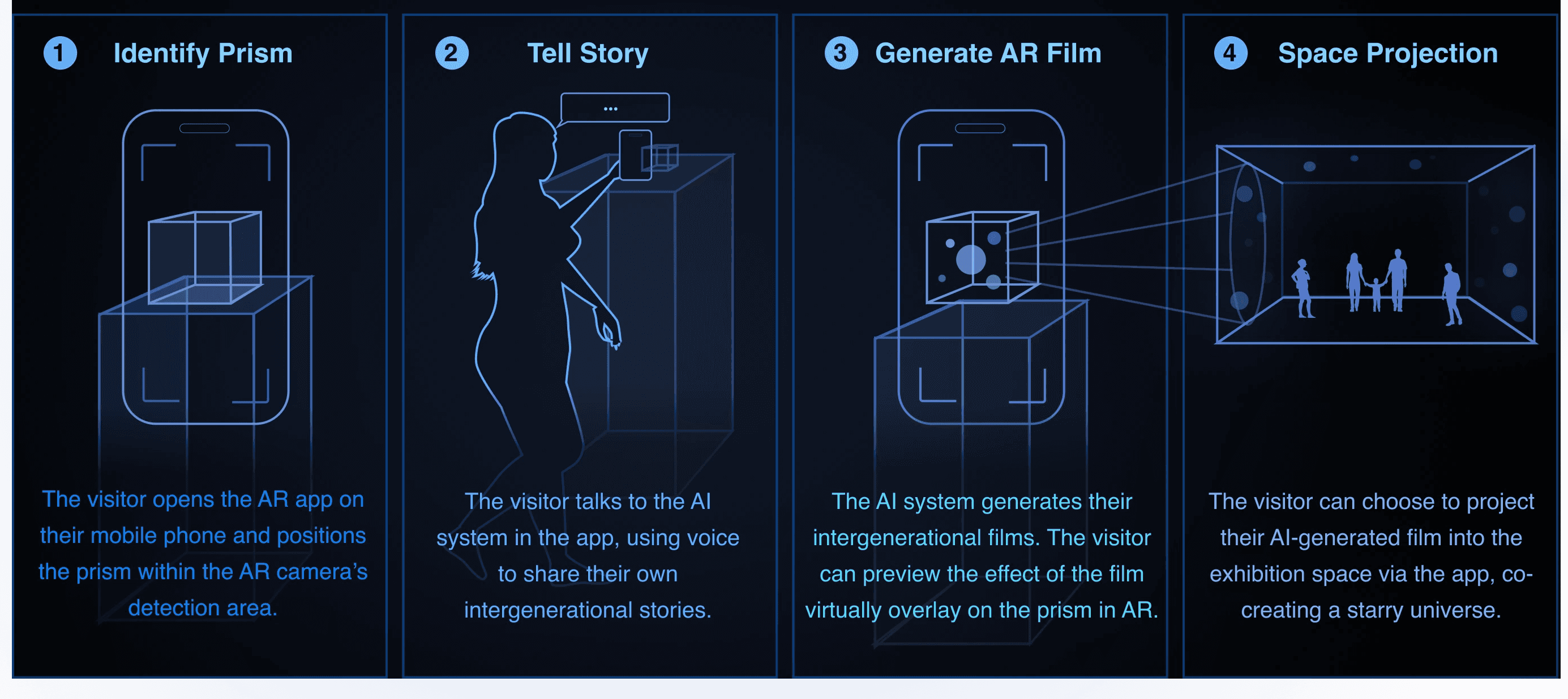 Visitors are encouraged to interact with the AR prism to generate their own intergenerational stories and project them into the space, creating a collaborative exhibition environment.