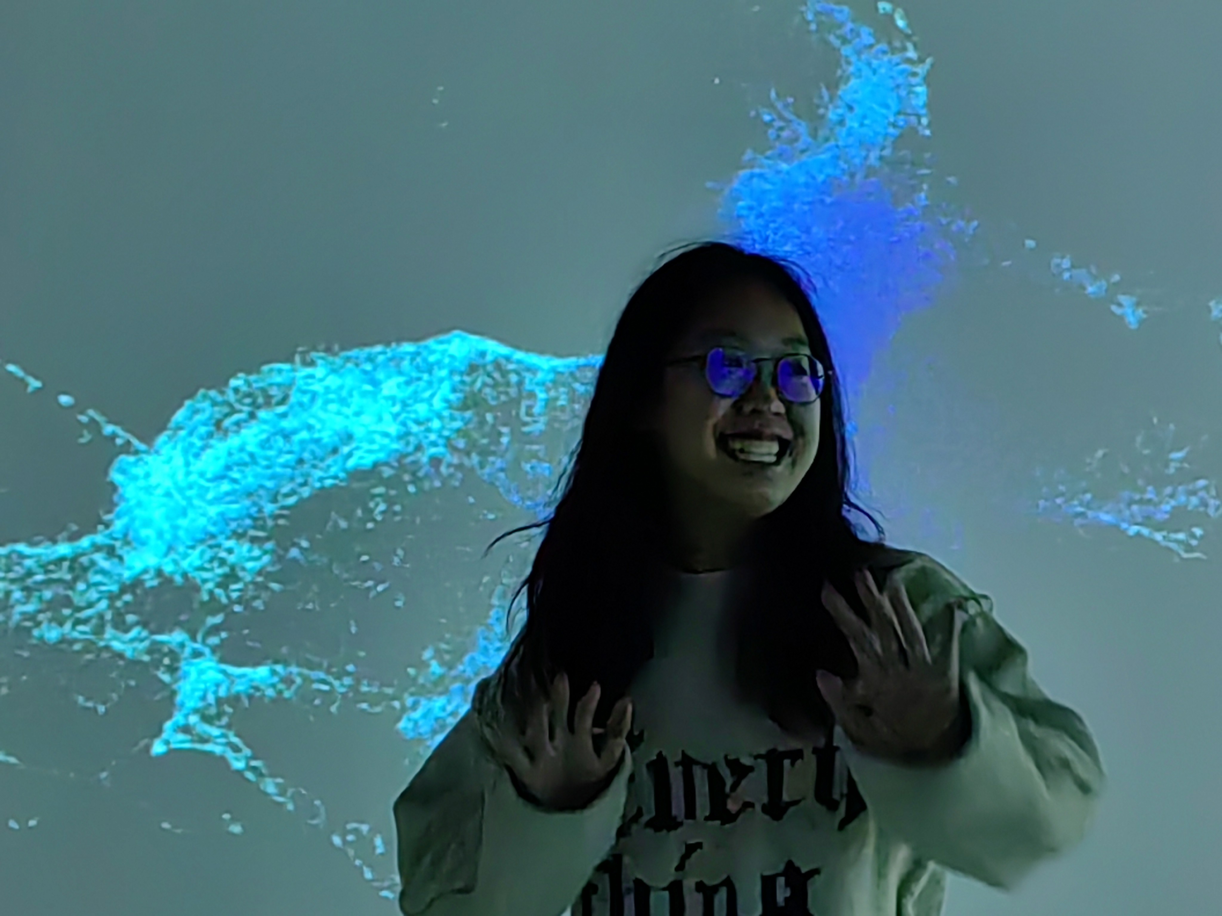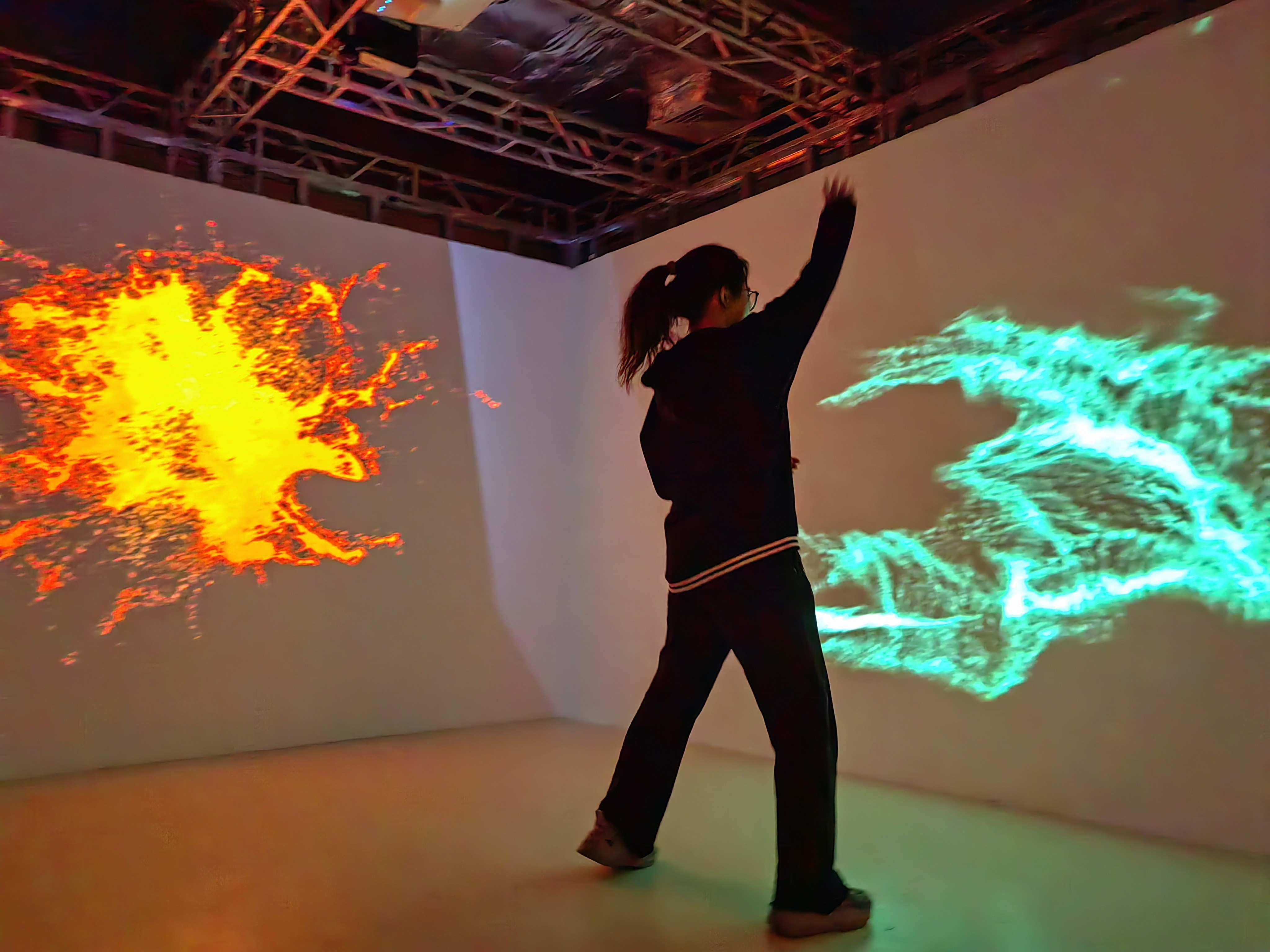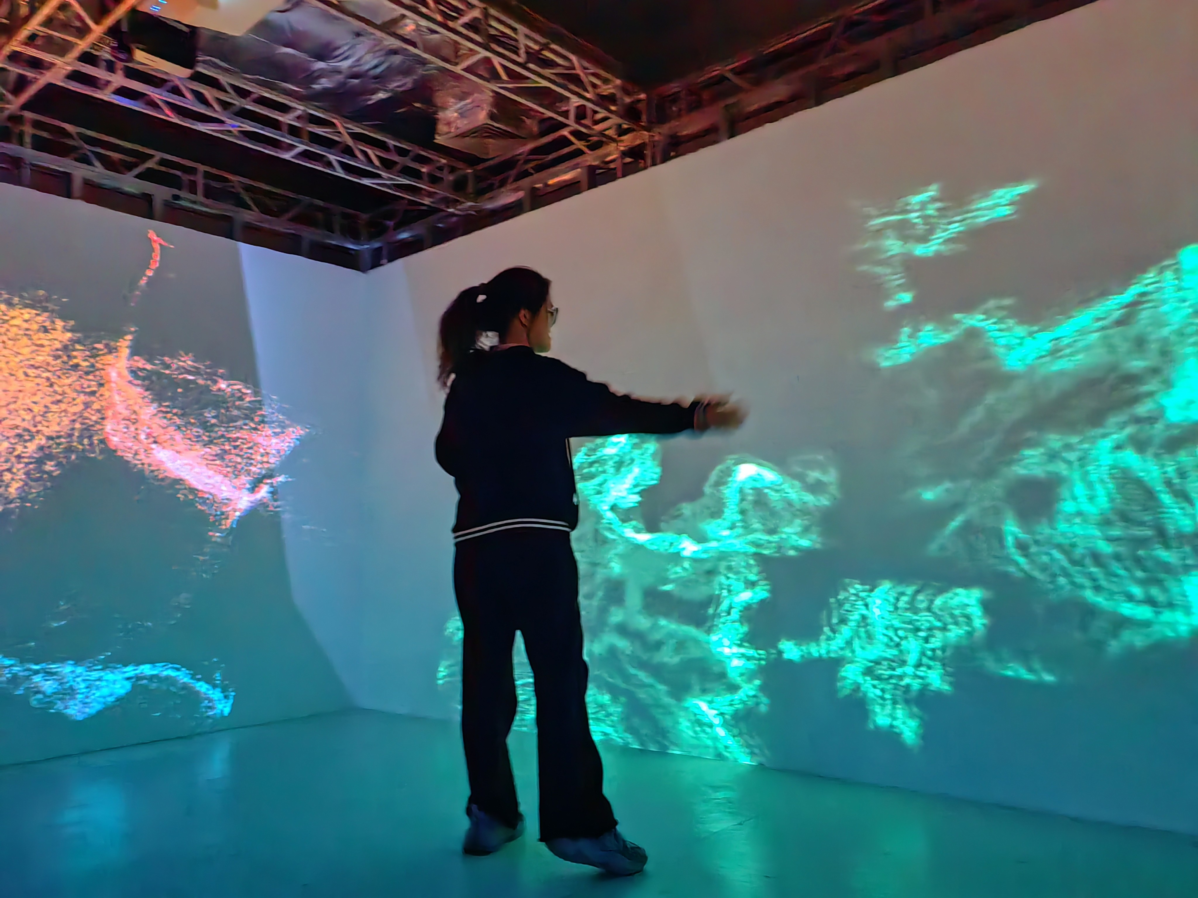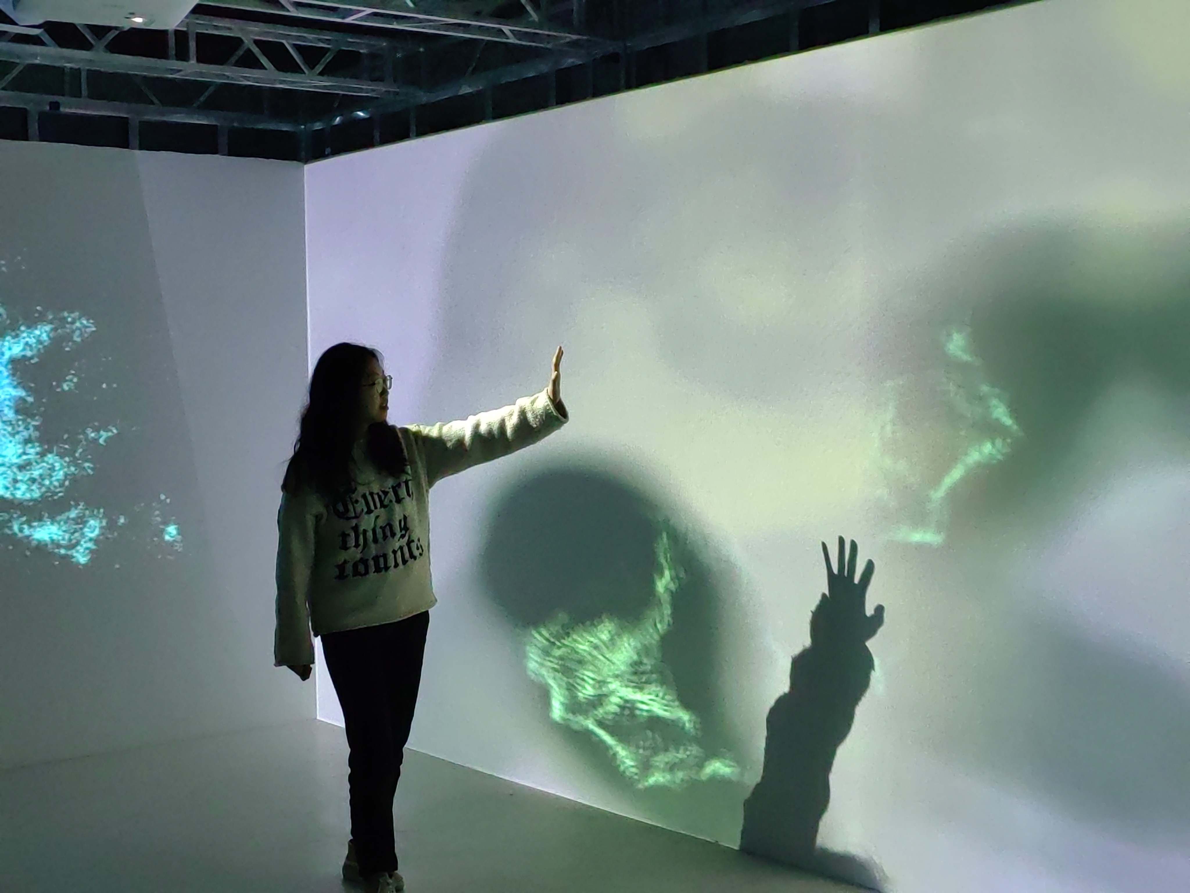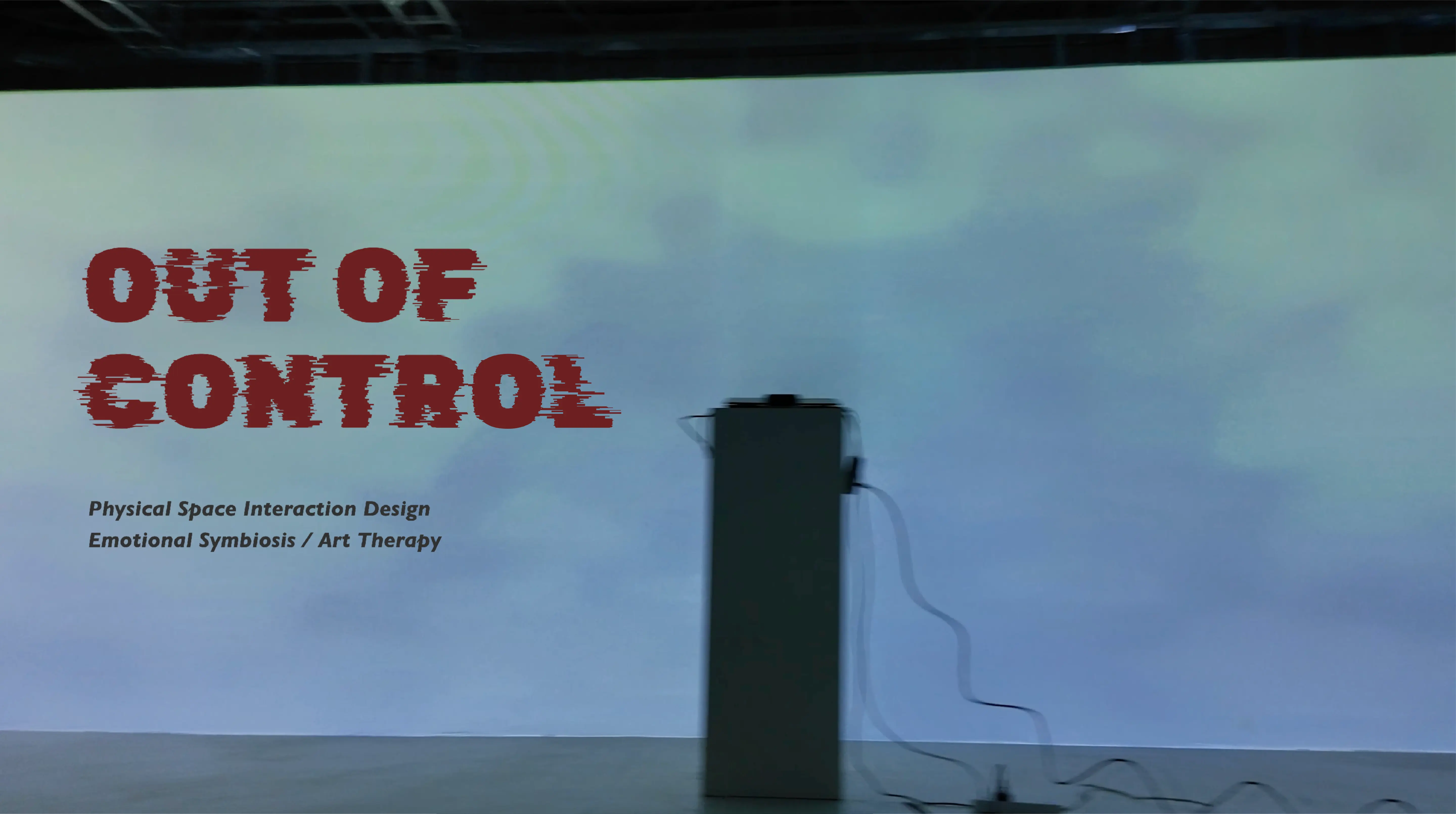 Out of Control is a spatial interaction that explores the contemporary anxiety of losing control. Using Kinect motion capture and spatial projection, it creates a chaotic audiovisual environment where participants wipe away virtual fog. This simple, controllable gesture dynamically alters thermal imagery, soundscapes, and heart-rate visualizations in real-time. Through this multi-sensory interaction, the work reflects on the nuanced interplay between technology and human emotion, inviting participants to deconstruct and reflect upon their own perceptions of control and chaos within an immersive experience.