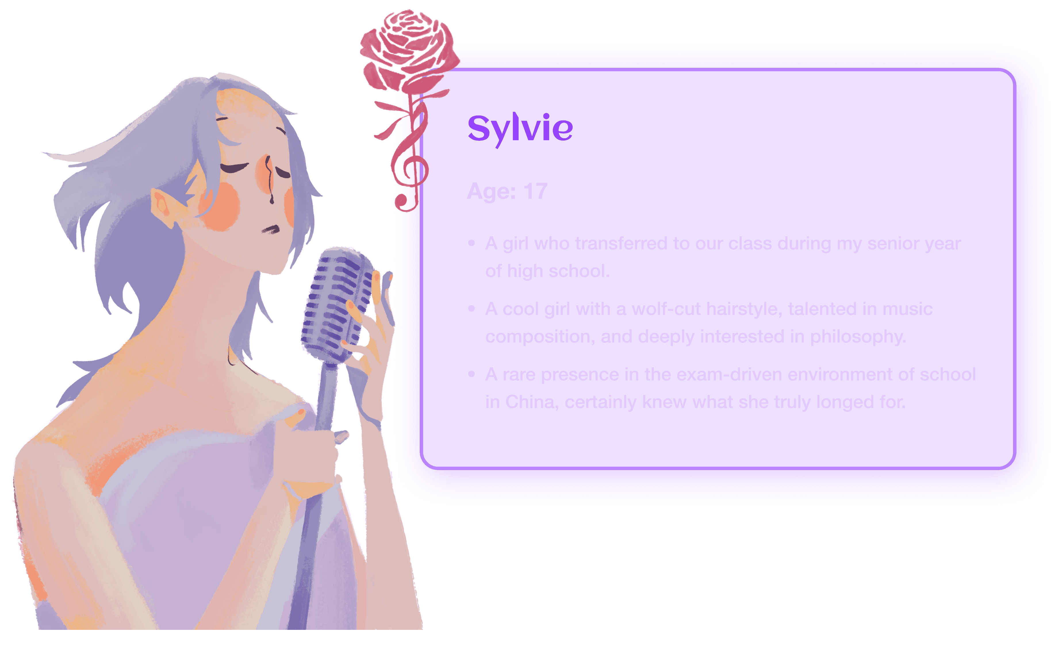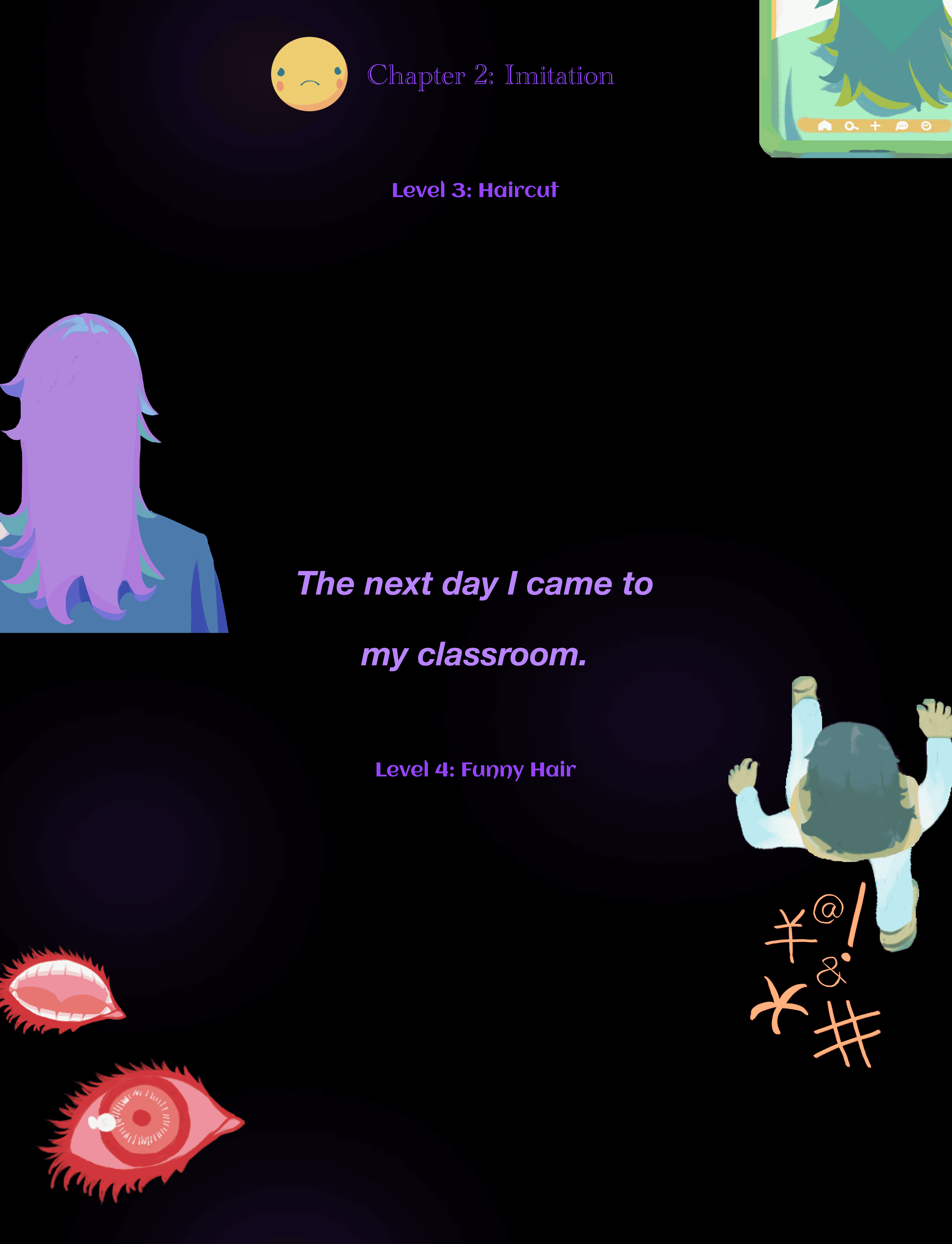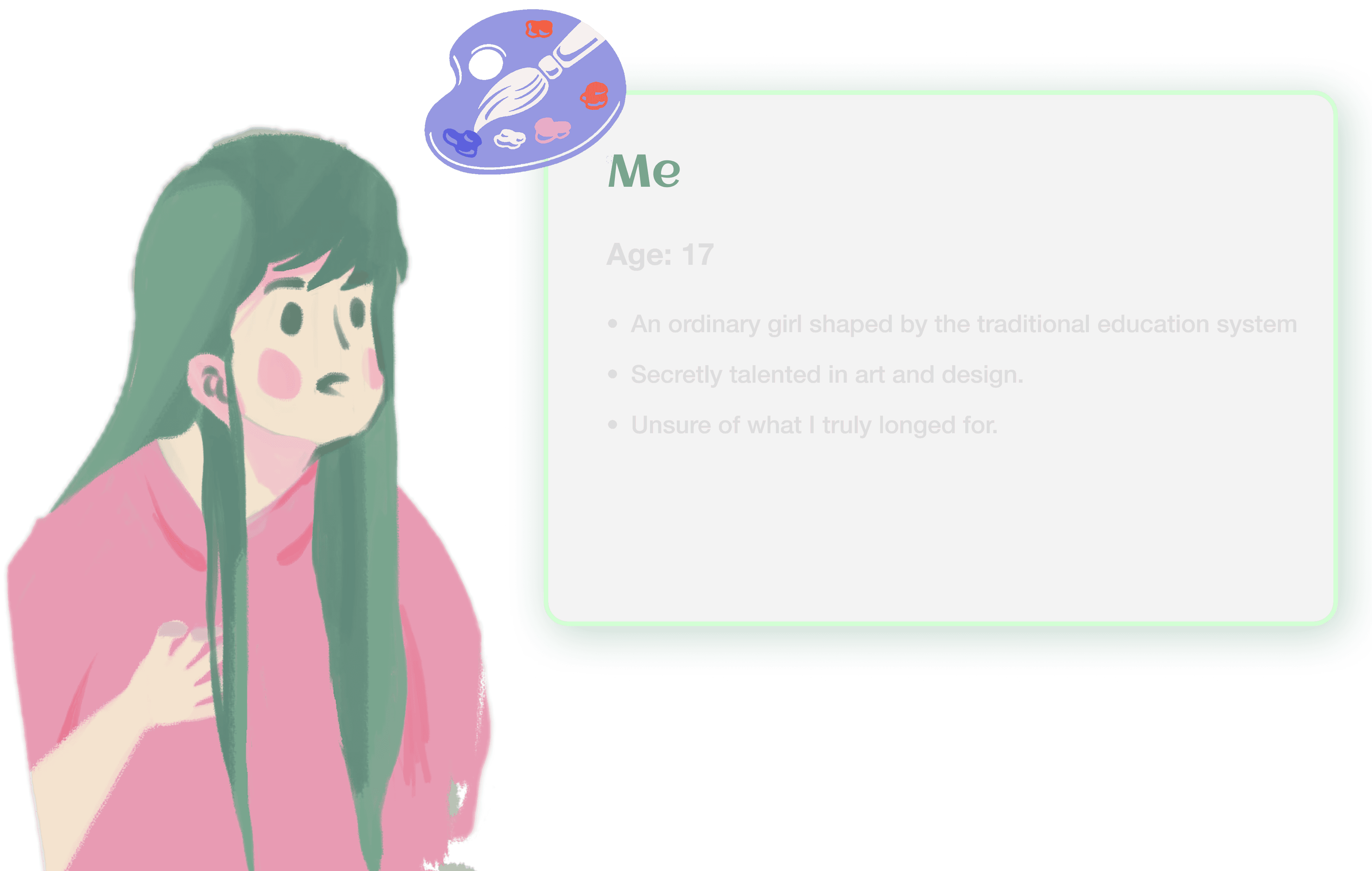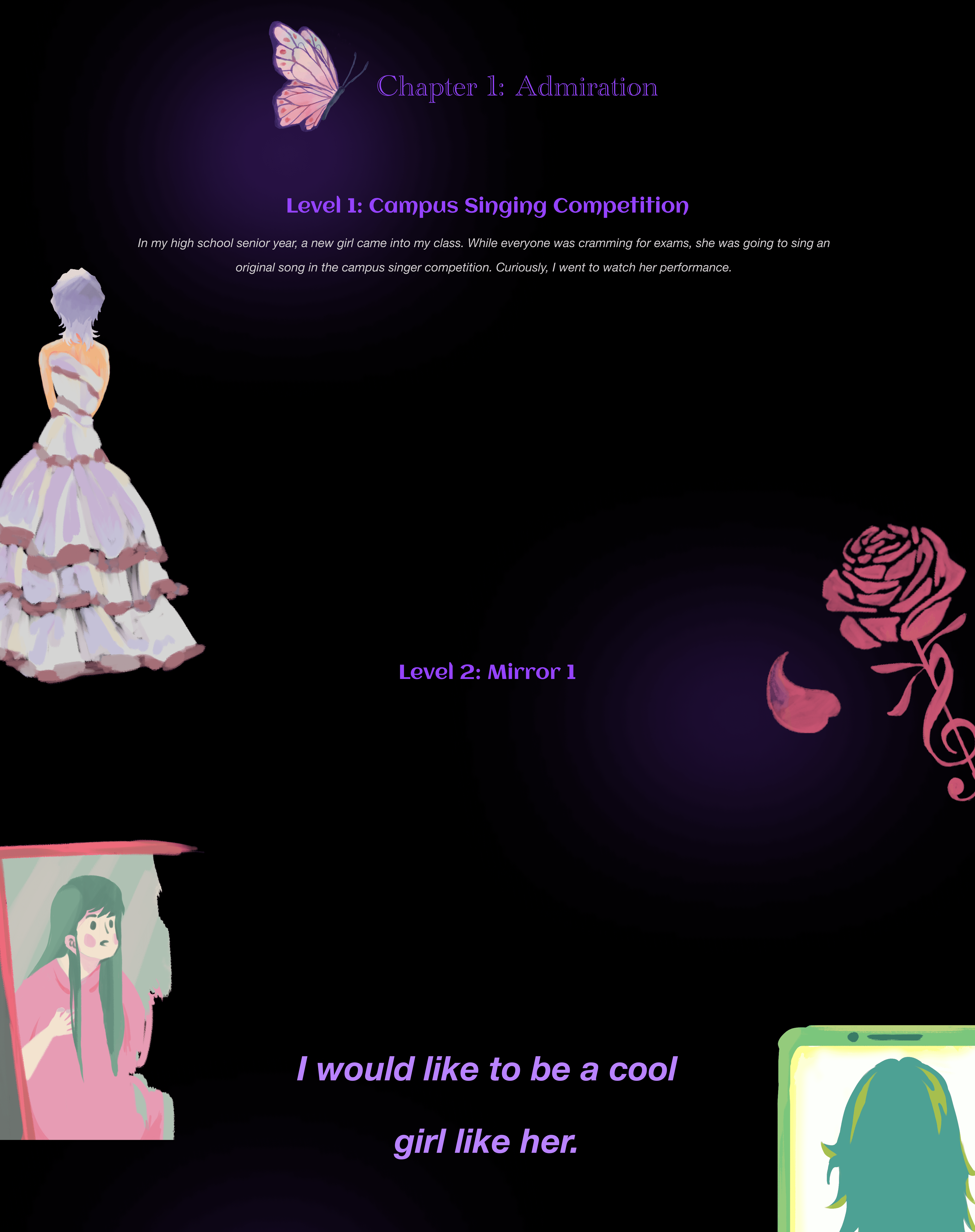Rose & Palette is an interactive narrative game inspired by my high school experience. It tells the story of an ordinary girl who becomes deeply fascinated by a very cool new classmate. As she increasingly mimics the other girl's behavior and style, she gradually loses her self-esteem and identity. The game uses thoughtful interactive mechanics to immerse players in this emotional journey of admiration, imitation, and eventual self-rediscovery. It aims to offer a reflective and healing experience for anyone who has ever felt overshadowed while searching for their own voice.