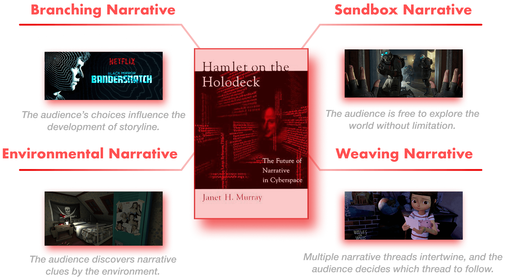Janet Murray proposes four interactive narrative models in his book: Hamlet on the Holodeck: