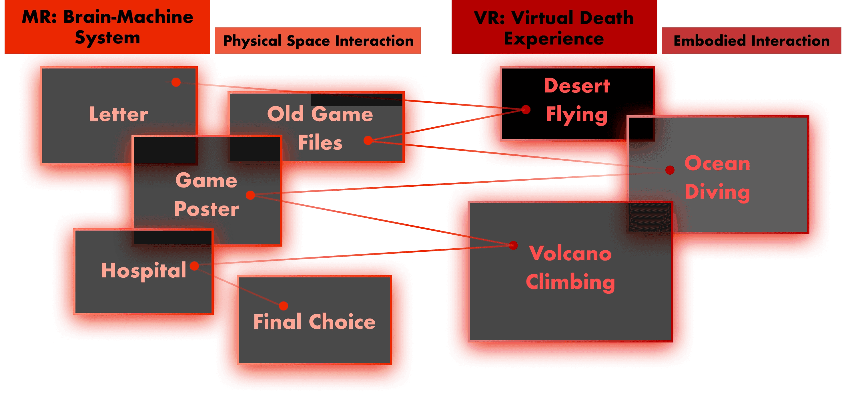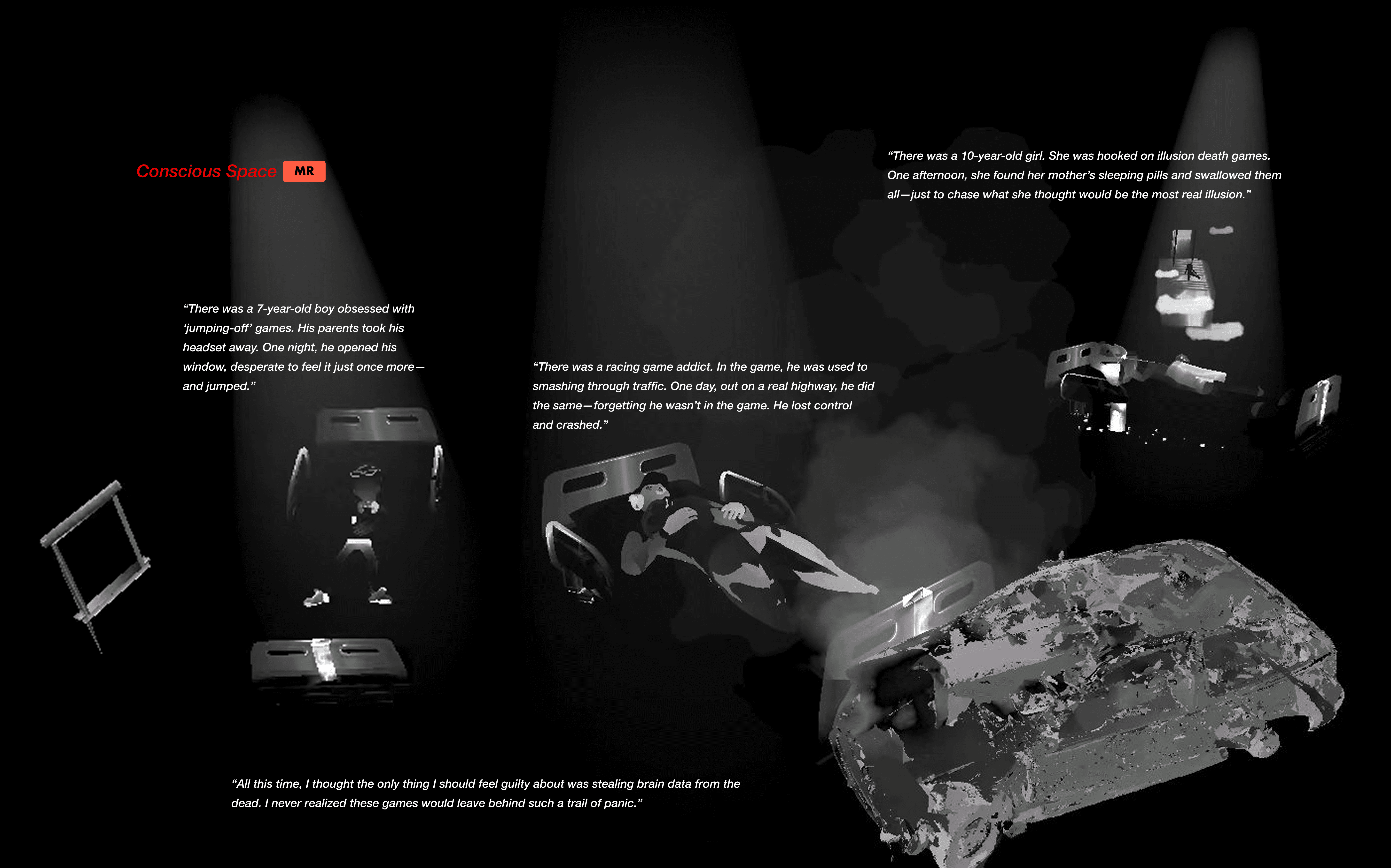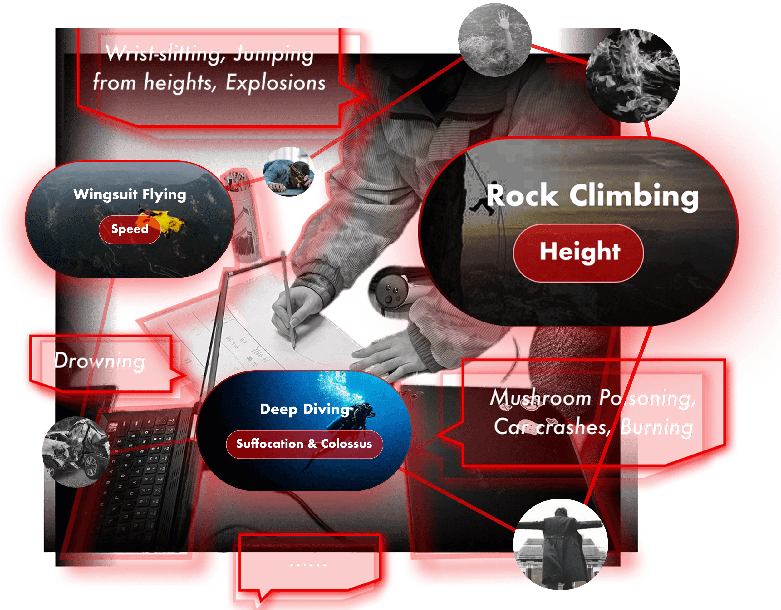 We conducted research to gather various forms of death that people wished to experience. We hope to utilize the most unique traits of VR--immersive and sensory impact, so we ultimately selected these three extreme sports as representations of death.