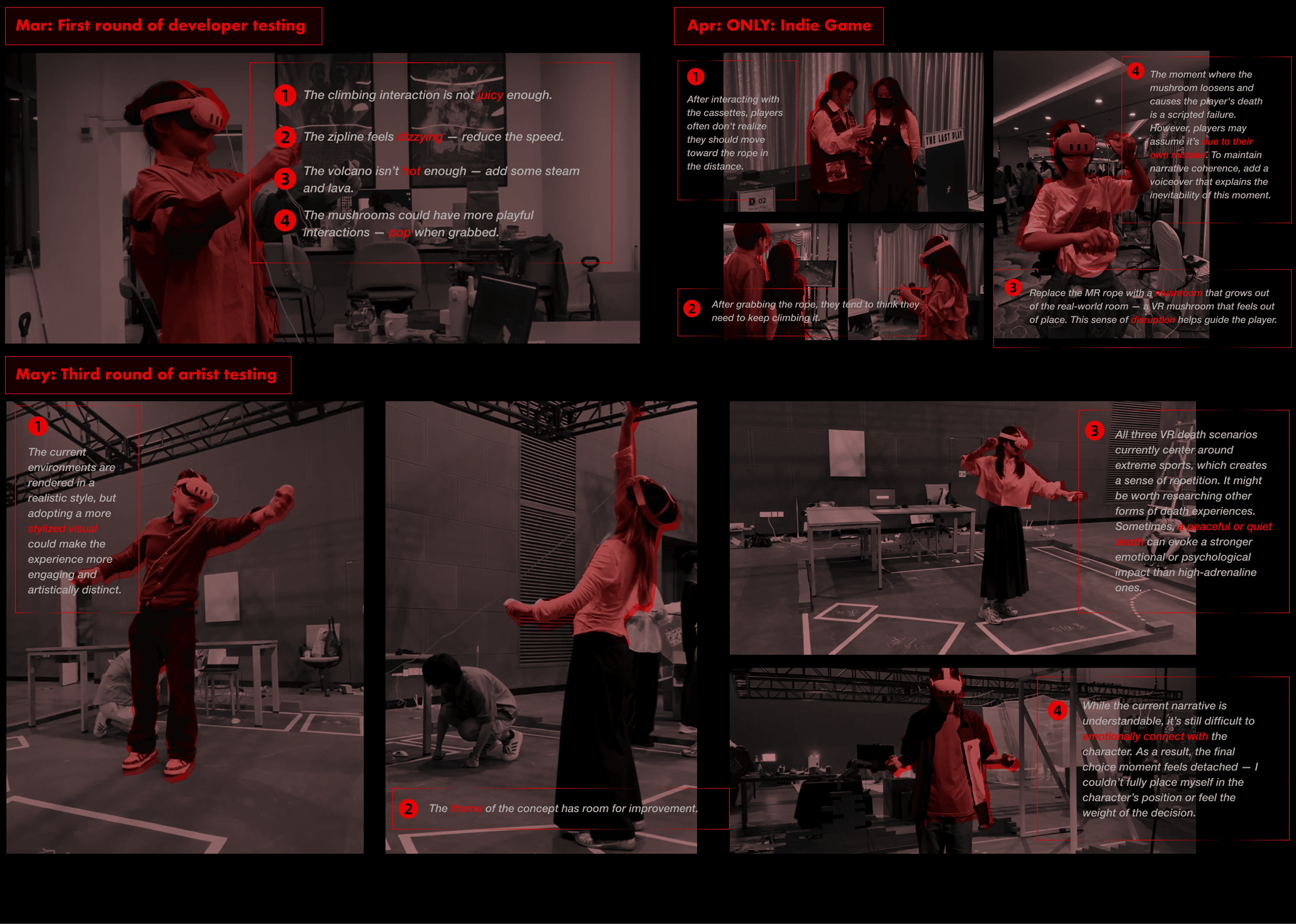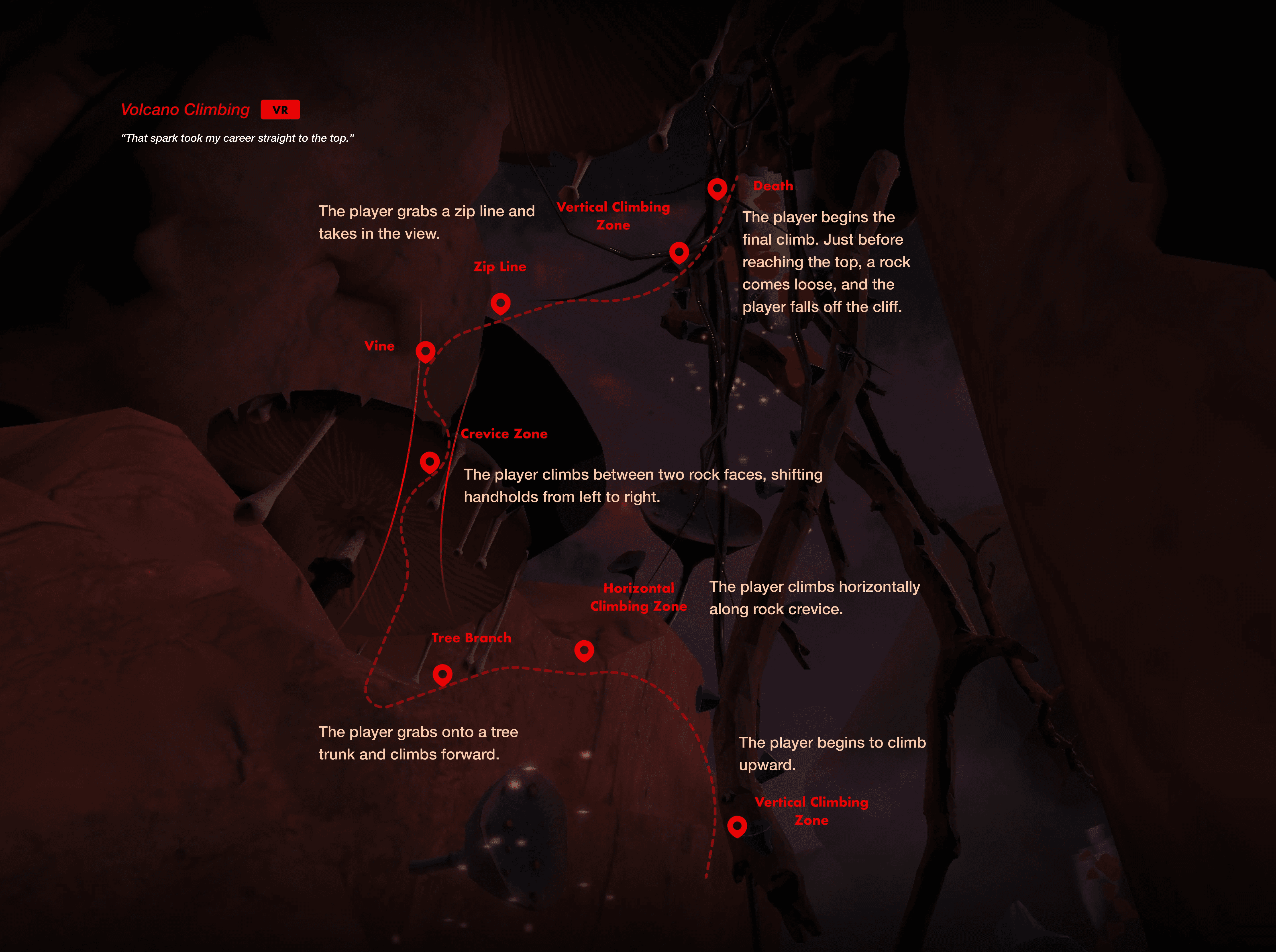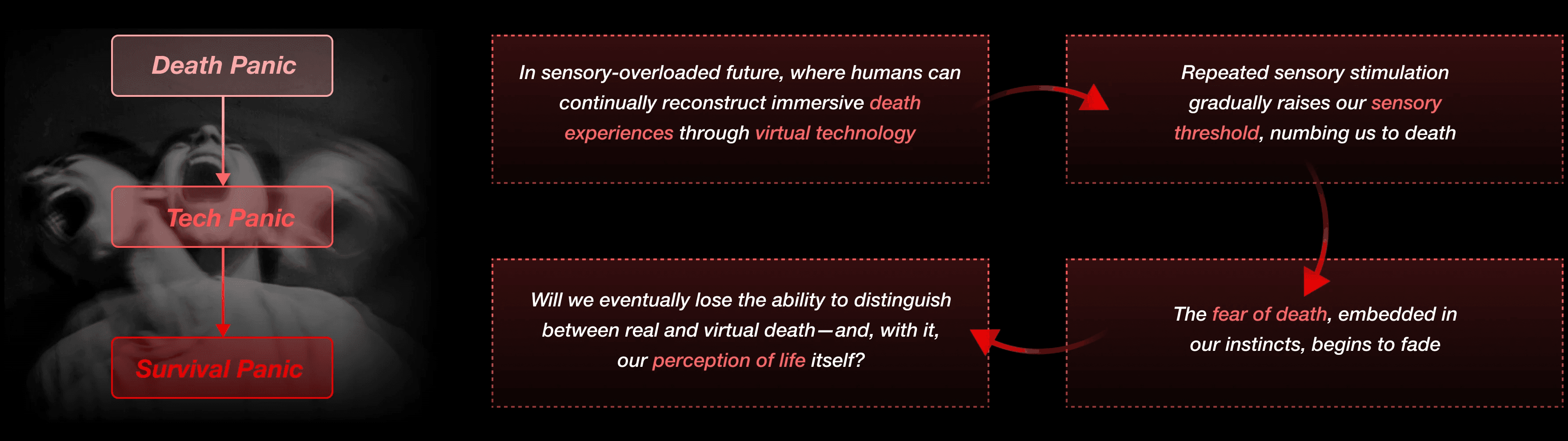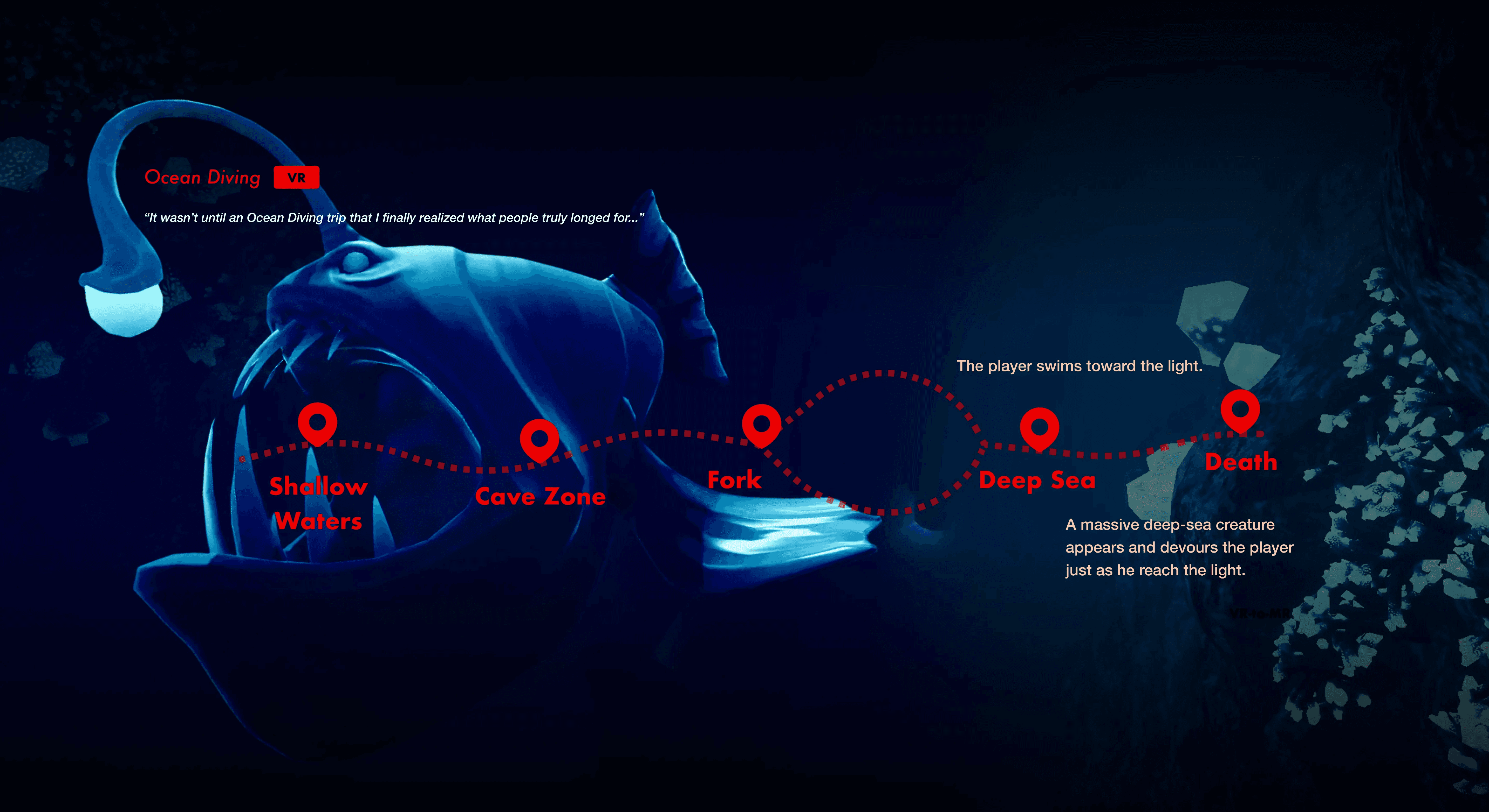We conducted research to gather various forms of death that people wished to experience. We hope to utilize the most unique traits of VR--immersive and sensory impact, so we ultimately selected these three extreme sports as representations of death.